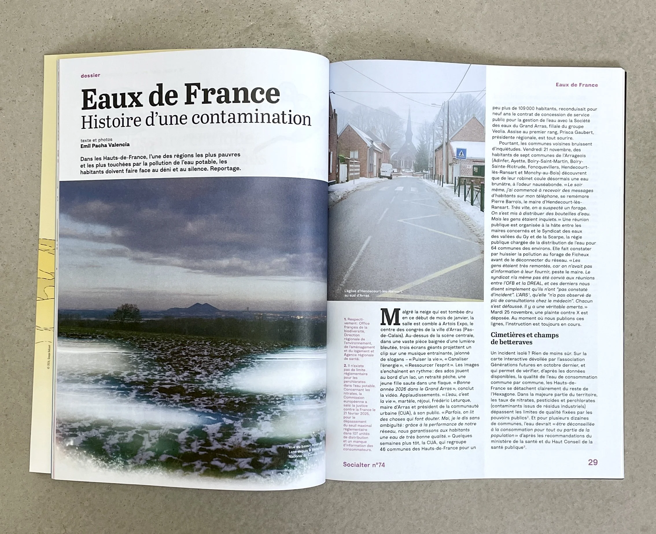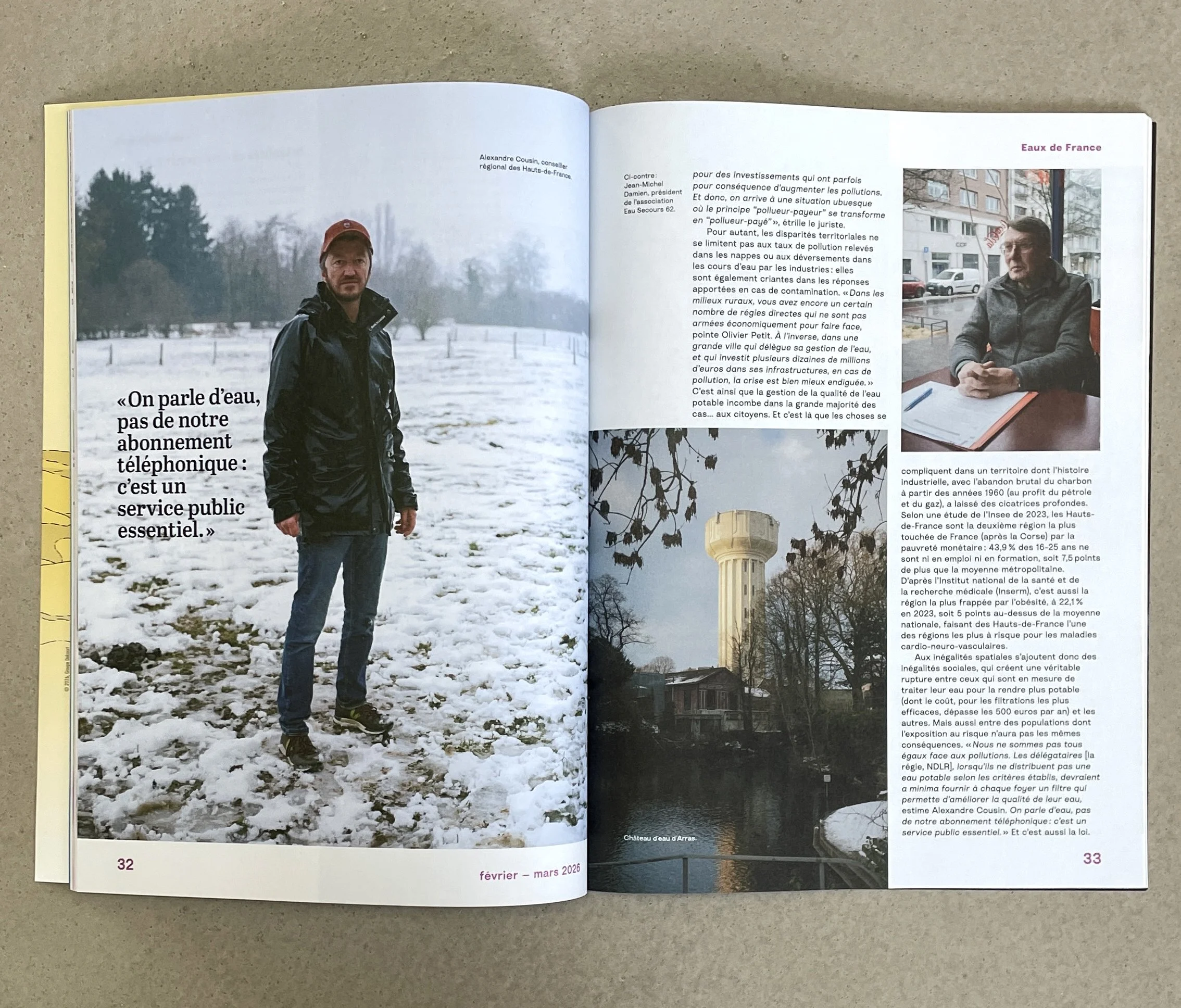 Malgré la neige qui est tombée dru en ce début de mois de janvier, la salle est comble à Artois Expo, le centre des congrès de la ville d’Arras (Pasde- Calais). Au-dessus de la scène centrale, dans une vaste pièce baignée d’une lumière bleutée, trois écrans géants projettent un clip sur une musique entraînante, jalonné de slogans – « Puiser la vie », « Canaliser l’énergie », « Ressourcer l’esprit ». Les images s’enchaînent en rythme : des ados jouent au bord d’un lac, un retraité pêche, une jeune fille saute dans une flaque. « Bonne année 2026 dans le Grand Arras », conclut la vidéo. Applaudissements. « L’eau, c’est la vie », martèle, réjoui, Frédéric Leturque, maire d’Arras et président de la communauté urbaine (CUA), à son public. « Parfois, on lit des choses qui font douter. Moi, je le dis sans ambiguïté : grâce à la performance de notre réseau, nous garantissons aux habitants une eau de très bonne qualité. » Quelques semaines plus tôt, la CUA, qui regroupe 46 communes des Hauts-de-France pour un peu plus de 109 000 habitants, reconduisait pour neuf ans le contrat de concession de service public pour la gestion de l’eau avec la Société des eaux du Grand Arras, filiale du groupe Veolia. Assise au premier rang, Prisca Gaubert. […]
