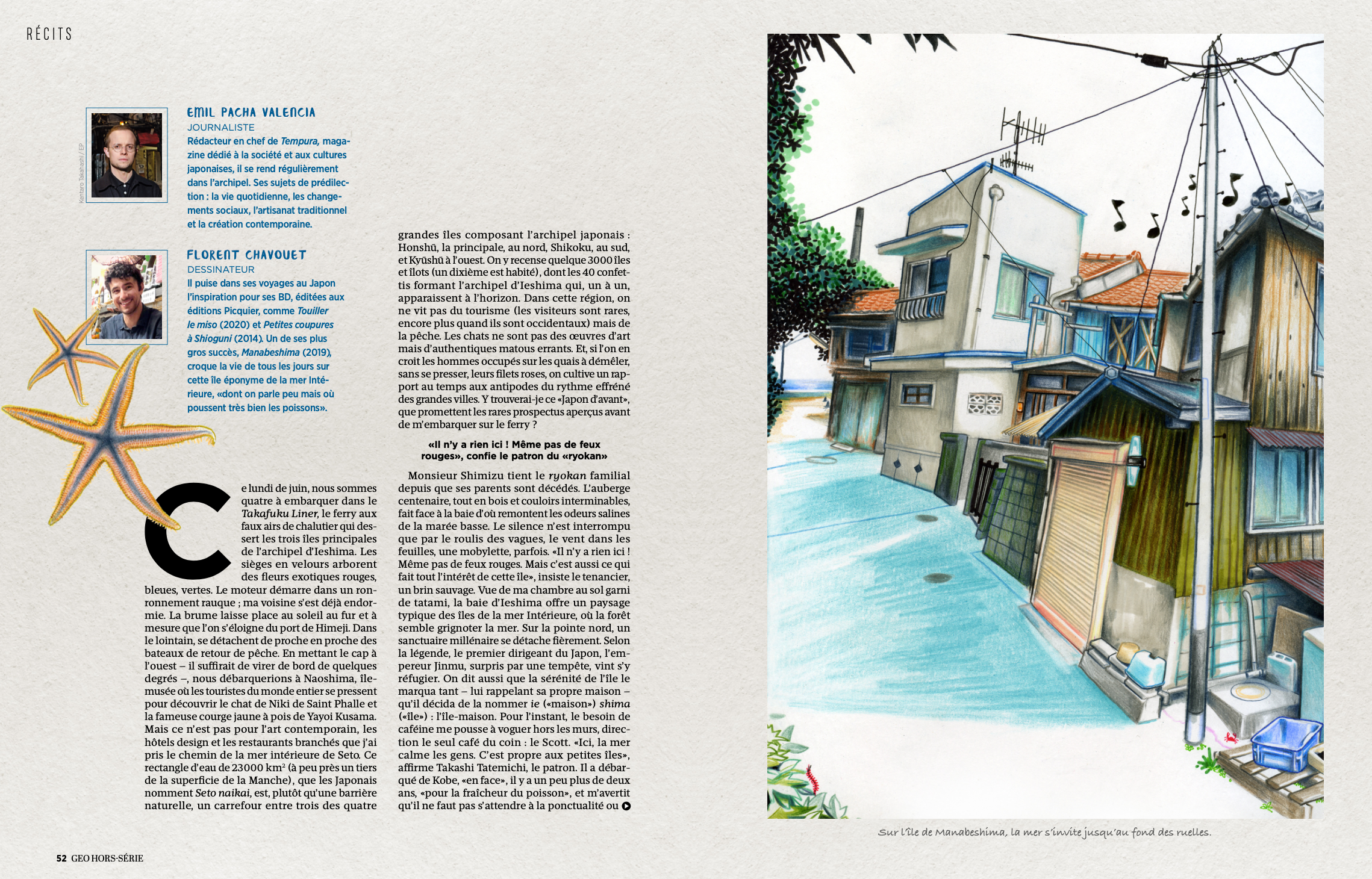 […] Ainsi, si la baisse démographique dans l’archipel d’Ieshima suit la tendance du Japon dans son ensemble, elle n’est pas nécessairement plus forte, à la faveur d’un phénomène que les experts appellent «U-turn», c’est-à-dire le retour des jeunes sur les îles après une expérience à la ville ou des études universitaires. Mais aussi grâce aux néoruraux. «Le cas des femmes est particulièrement intéressant, développe Philippe Pelletier. Elles viennent souvent des métropoles pour s’extirper d’un monde de l’entreprise encore largement patriarcal. Elles trouvent sur ces îles un mode de vie plus autonome. Reste à savoir si ces nouveaux arrivants sont dans une logique purement individuelle ou s’ils désirent s’insérer et s’impliquer dans ces communautés.» Sur Bozejima, l’île voisine à moins de dix minutes de bateau, je débarque sous une pluie de fin du monde. Je m’abrite sous une sorte de cabane en bois, entre les chats errants et les filets de pêche. En face, le minuscule sanctuaire de Bentenjima est dédié au dieu de la mer. Les pêcheurs viennent y déposer des bouteilles d’eau-de-vie en guise d’offrandes. Le cuir tanné par le soleil et le crâne rasé, un homme observe la mer, le regard sombre. «C’est dangereux de partir en mer par ce temps, mais parfois on n’a pas le choix, on ne peut pas se permettre de perdre un jour de travail, m’explique Kobayashi-san, un pêcheur d’iwashi, la sardine japonaise. Il y a deux fois moins de poisson qu’avant, il faut aller toujours plus loin, donc les prix augmentent, et les gens en mangent moins.» Kobayashisan est né et a grandi à Bozejima. Il vit dans une maison toute proche du port avec son épouse. Si son fils a repris le métier de son père, ce n’est plus vraiment la norme selon lui. «La vie de pêcheur, c’est solitaire, et c’est plus dur qu’avant. C’est pour ça que les jeunes ne veulent plus faire ce métier. On s’y habitue pourtant», dit-il en me montrant ses mains calleuses dans un large sourire.
