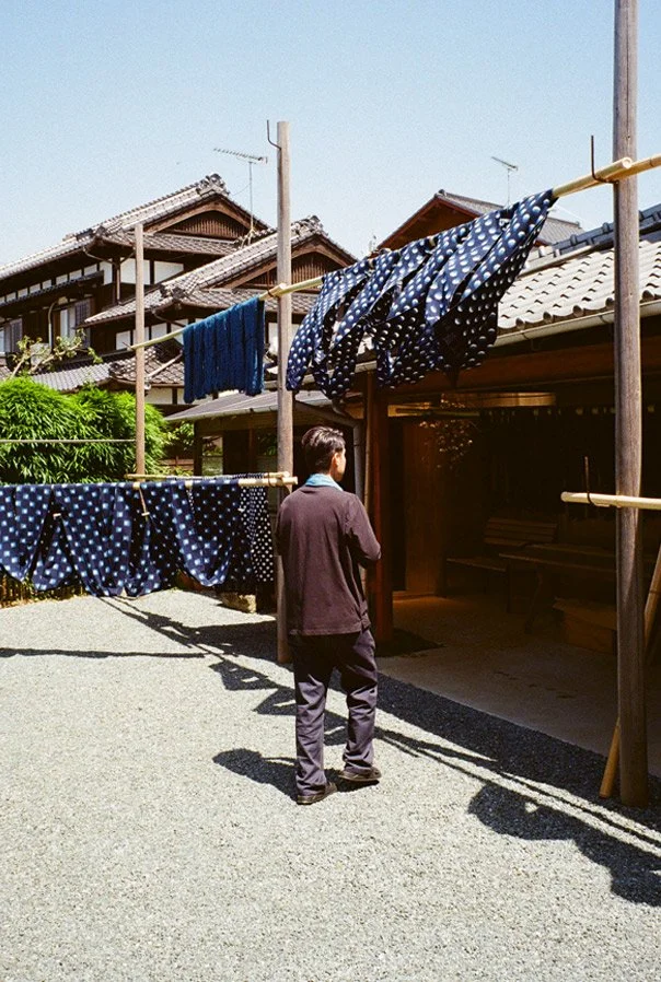 Devant la petite fabrique, de longs rubans de coton d’un bleu profond sèchent au vent. Difficile de croire que cette couleur si unique, que les designers de mode s’arrachent de Lemaire à Jimmy Choo, trouve son origine dans ce liquide marronvert. « C’est l’oxydation de l’indigo au contact de l’air qui provoque ce changement de couleur, du marron vers le bleu. Il ne sert donc à rien de laisser tremper un tissu longtemps dans la cuve si on veut un bleu plus profond. Il faut répéter le geste de trempage, puis d’essorage à l’air, et ainsi de suite. C’est cela qui donnera une teinte plus ou moins intense. Parfois, on peut répéter ces gestes jusqu’à 50 fois. » C’est ce procédé qui fait la réputation des indigos de la région de Kurume depuis plus de 200 ans, le Kurume kasuri. La sueur, les lavages, les frottements, le repassage : le bleu perd à peine de son intensité à travers le temps.